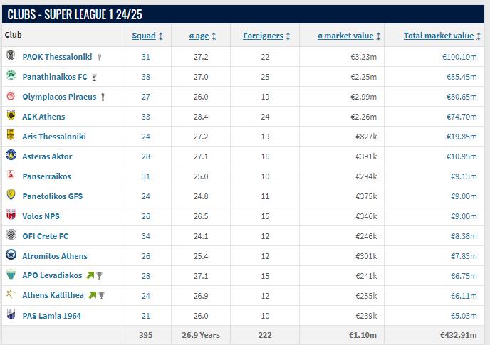 Το πιο ακριβό περιουσιακό στοιχείο των Πρωταθλητών παραμένει ο Γιάννης Κωνσταντέλιας με χρηματιστηριακή αξία στα 15 εκατομμύρια, ακολουθεί στη δεύτερη θέση, πλέον, ο Φεντόρ Τσάλοφ με 11 εκατομμύρια και στην τρίτη θέση συναντάμε τον Αντρίγια Ζίβκοβιτς με αξία στα 8 εκατομμύρια.